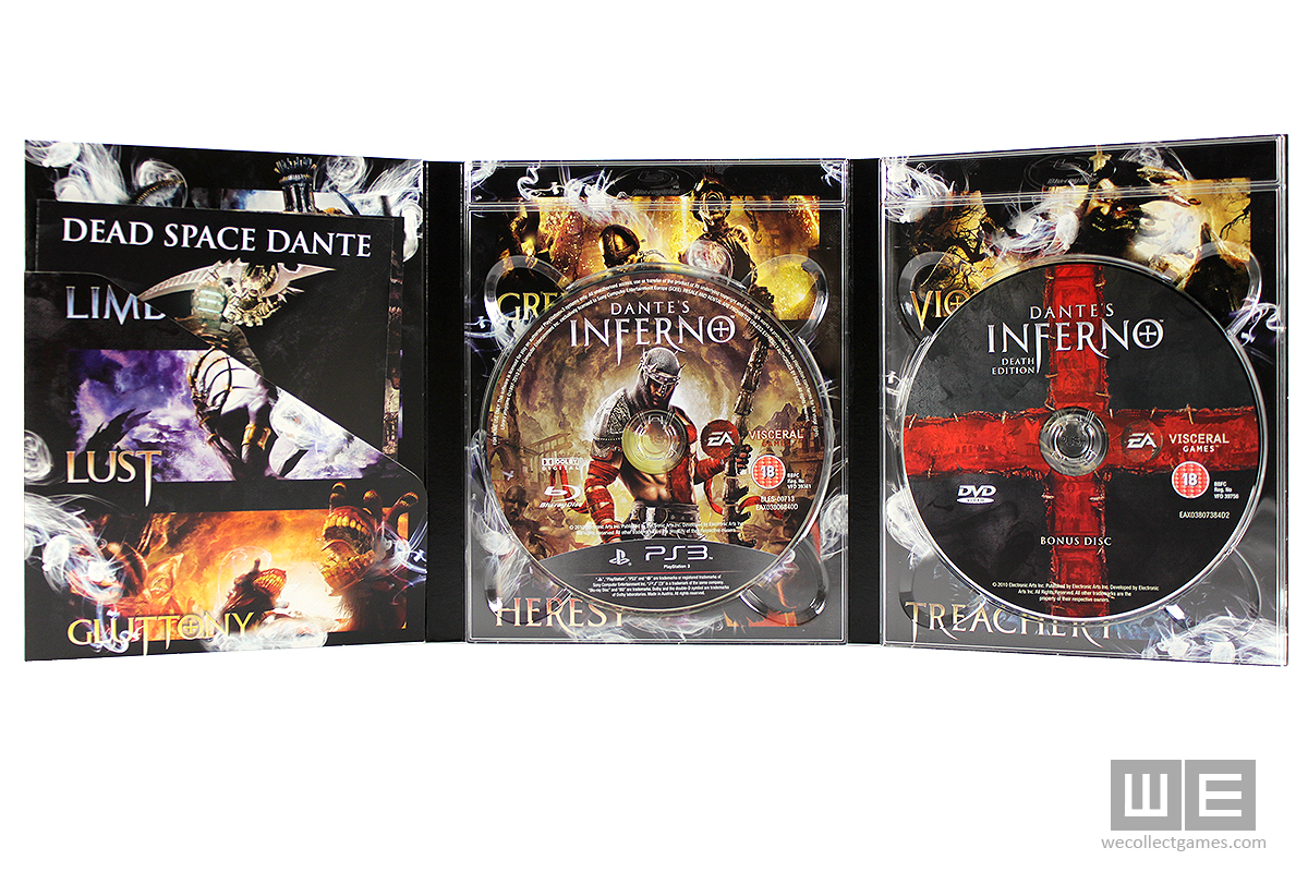 A Death Edition borítójához hasonlót eddig még nemigen láttunk. Képek alapján azt hihetnénk, hogy ugyanúgy néz ki, mint a sima változaté, de a kezünkbe véve azonnal feltűnik, hogy ez egy 3D hatású, hologramos darab. Minőségét tekintve abszolút elégedettek lehetünk, mivel a kemény kartonpapír rendkívül tartósnak tűnik. Az ebben megbújó tárolóról újfent csak a legjobbakat tudjuk elmondani. A kihajtható papírdoboz hátsó oldalának egészén maga a Halál terül el, kinyitva pedig a pokol 9 köréről, valamint az azokhoz tartozó főellenségekről láthatunk egy-egy képet. Itt találjuk továbbá a játék lemezét, a bónusz DVD-t (megintcsak nem Blu-Ray), a kézikönyvet, valamint egy kódot, amivel a Dead Space-ből ismerős Isaac kosztümjét tudjuk letölteni. A bónusz lemezen meglehetősen sok extra bújik meg: fejlesztői kommentár, digitális artbook, soundtrack, információk magáról Dante-ról, a hamarosan elérhető Dante’s Inferno rajzfilmből egy részlet, valamint egy kód, amivel a játék hivatalos oldalán az teljes Isteni színjáték válik elérhetővé digitális formában.
