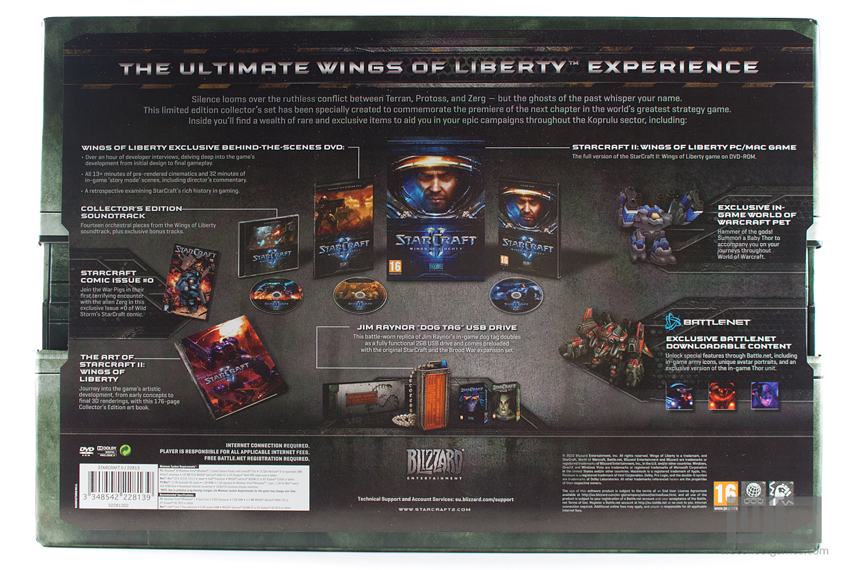 Elsőként magát a játékot vehetjük kézbe, amely egy egyszerű DVD tokban kapott helyet: ebben az elindításhoz szükséget CE szériaszámot (ez már tartalmazza az Battle.net-es letölthető extrákat), valamint a 4 darab “Guest Pass”-t találjuk, amellyel barátainkat hívhatjuk meg játszani (kettő darab World of Warcraftos és szintén kettő darab StarCraft II-s kódról van szó). Az interjúkat, fejlesztői kommentárokat és az átvezető videókat tartalmazó DVD mellett a hivatalos Soundtrack CD-t leljük, külön tokban, rajta 14 számmal.